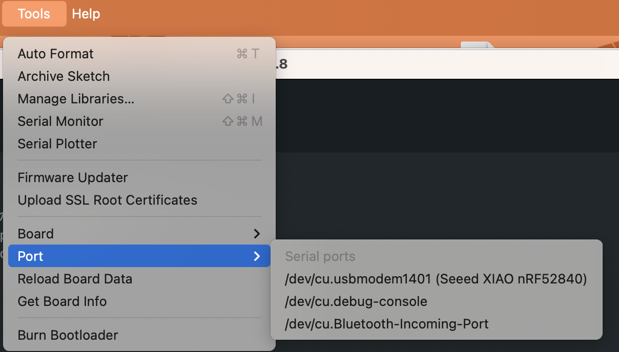 Tools->Portから、**Seeed Studio XIAO nRF52840**が接続されているポート(COMポートなど)を選択します。※macだとtoolsはウィンドウ内ではなくタスクバーにある