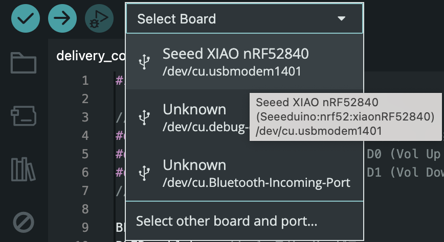 インストールしたIDEを起動してからPCとSeeed Studio XIAO nRF52840をUSBケーブルで接続します。