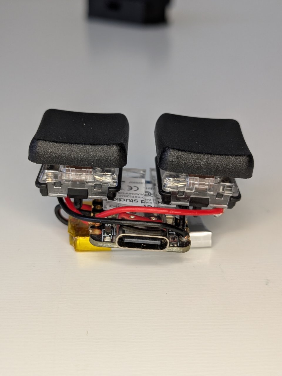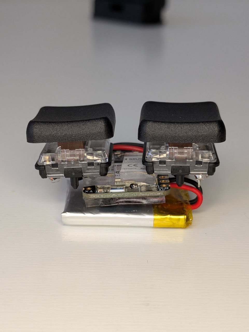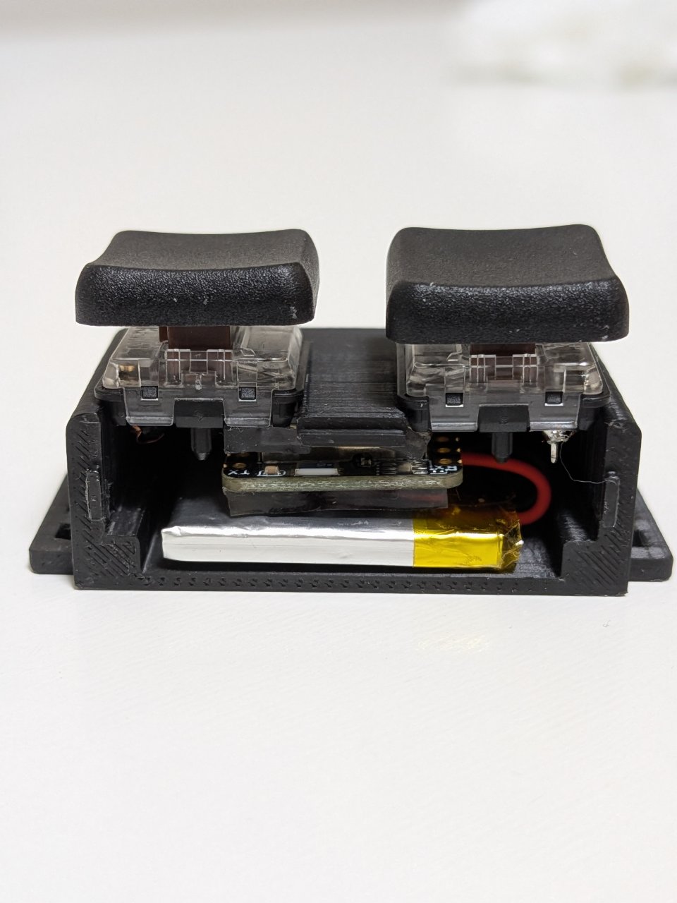 断線を防ぐため、ハンダ付け完了後すぐに、用意した1.8mm厚のゲル状両面テープを使用して、基板・バッテリー・キースイッチを3Dプリントケース内に一体化させてガッチリと固定します。このテープの厚みと弾力性が、衝撃吸収と配置の最適化を兼ねています。